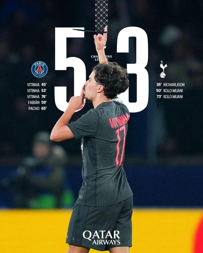第76分钟,我们获得点球机会,维蒂尼亚主罚命中,上演帽子戏法!5-3!